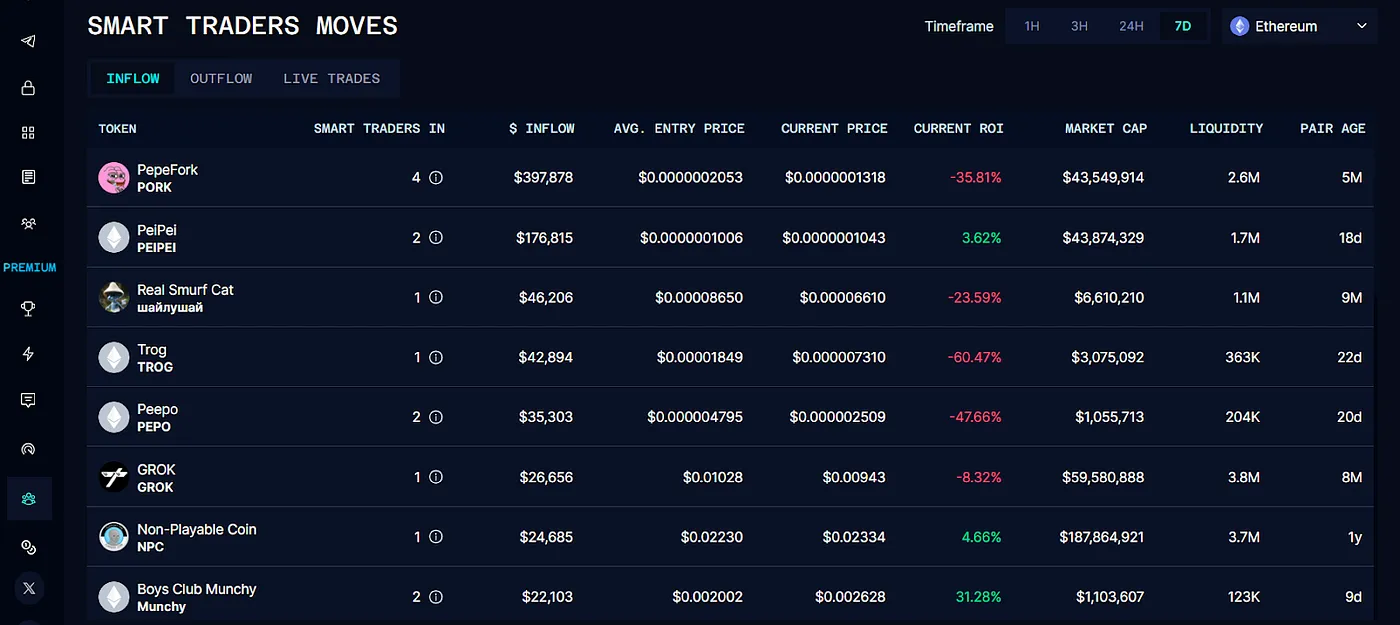 The dashboard provides detailed information on smart traders' inflows, outflows, and live trades: