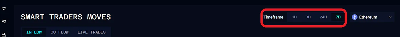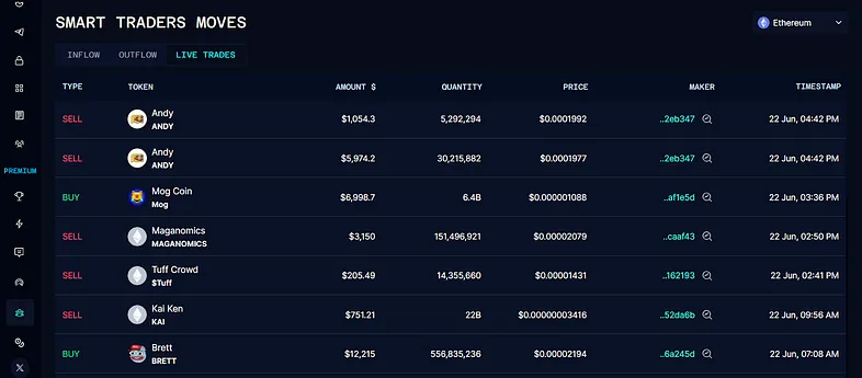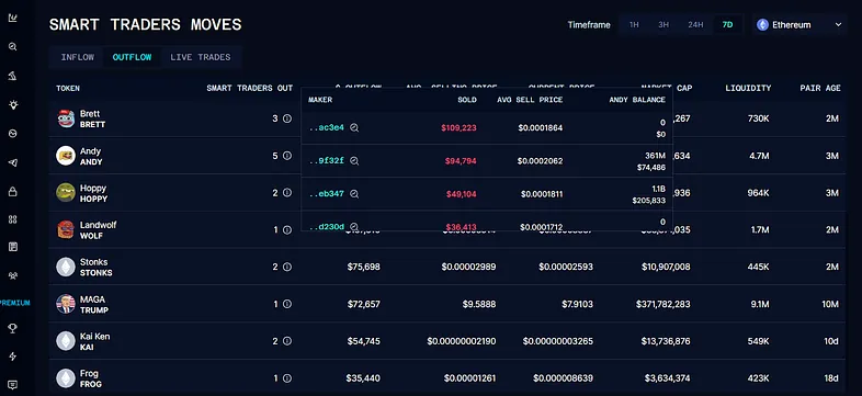Outflow Section: Tracks sell transactions by smart traders. Similar to the Inflow data, this section provides insights into how many traders are selling an asset. Hover over the information icon to see individual sell data and market data for each asset.